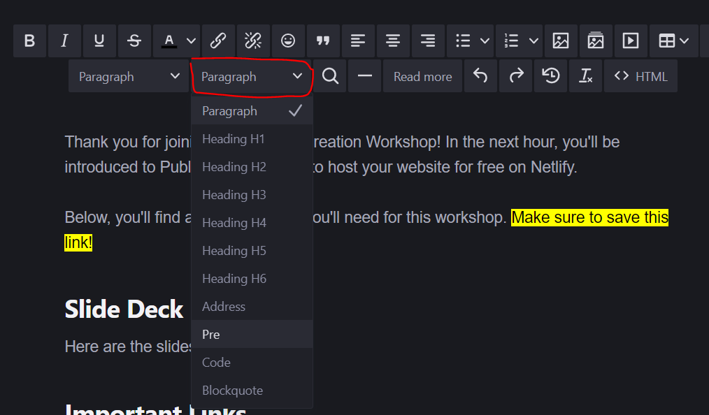 I’m going to keep looking through the TinyMCE docs to see if it’s possible to bundle two tags together (and potentially add default text), so that details + summary can be added together.